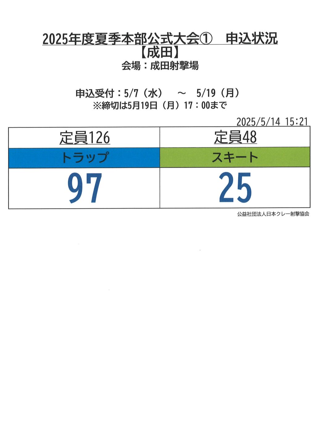 2025年度夏季本部公式大会①成田 申込状況<5月14日時点>