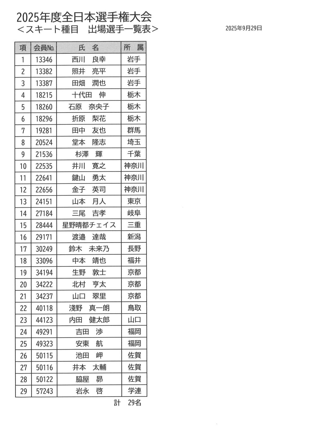 2025年度全日本選手権 スキート種目出場選手一覧表