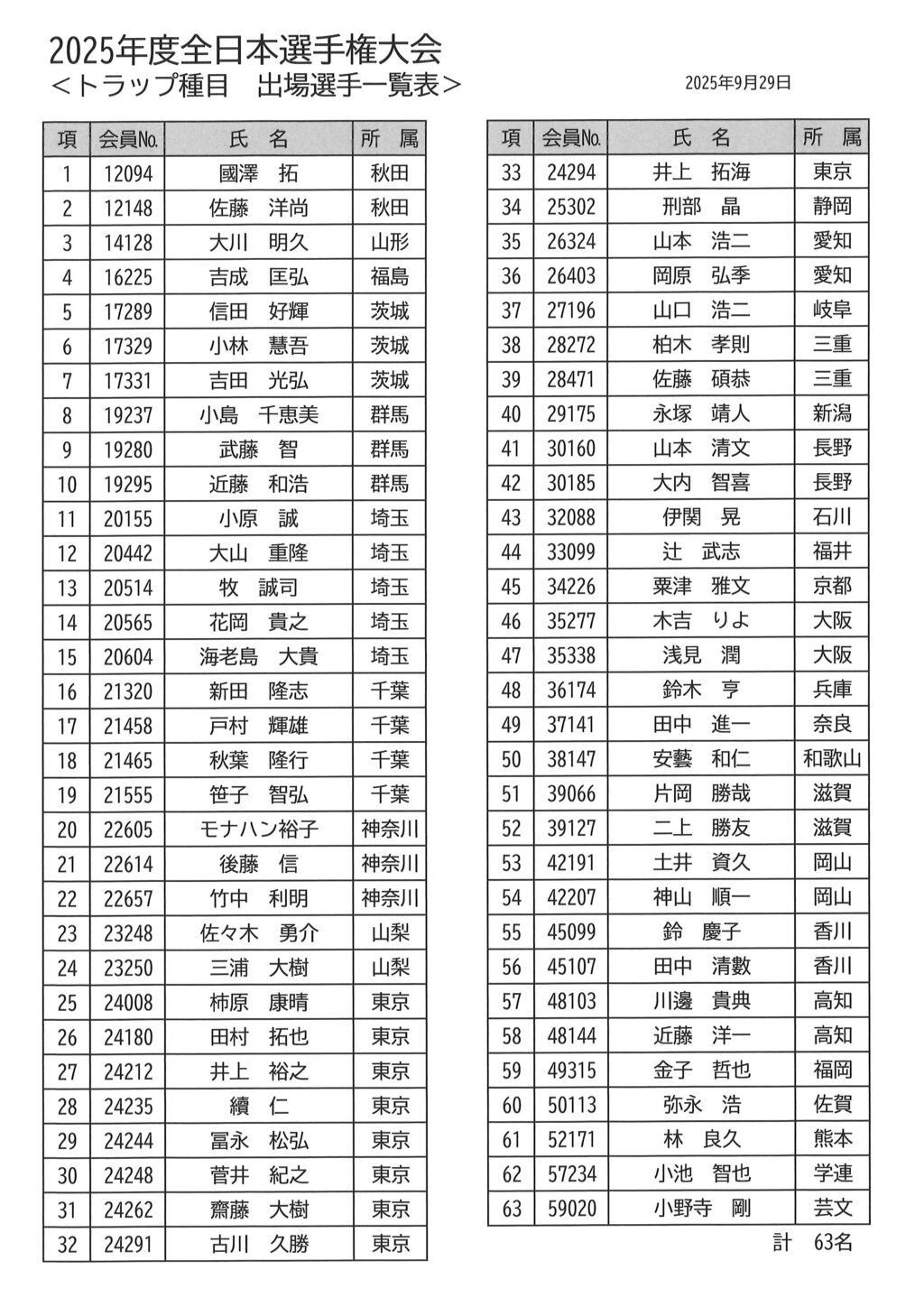 2025年度全日本選手権 トラップ種目出場選手一覧表