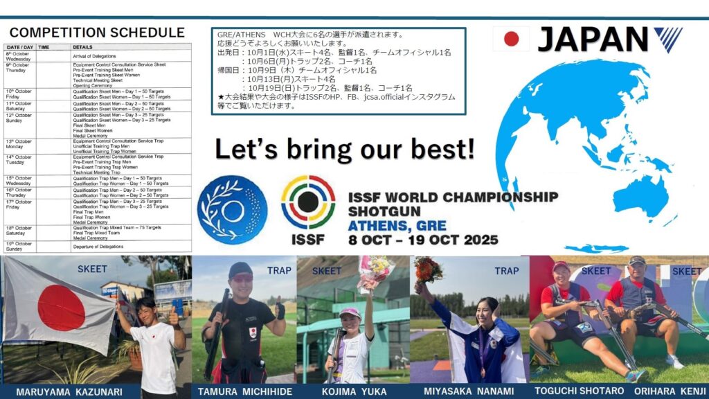 世界選手権大会(Athens, Greece 08 – 19 Oct 2025)選手派遣のお知らせ 2025年9月30日2025年9月30日 世界選手権大会(ISSF World Championship Shotgun) (Athens, Greece 08 – 19 Oct 2025)選手派遣のお知らせ 世界選手権ギリシャ告知