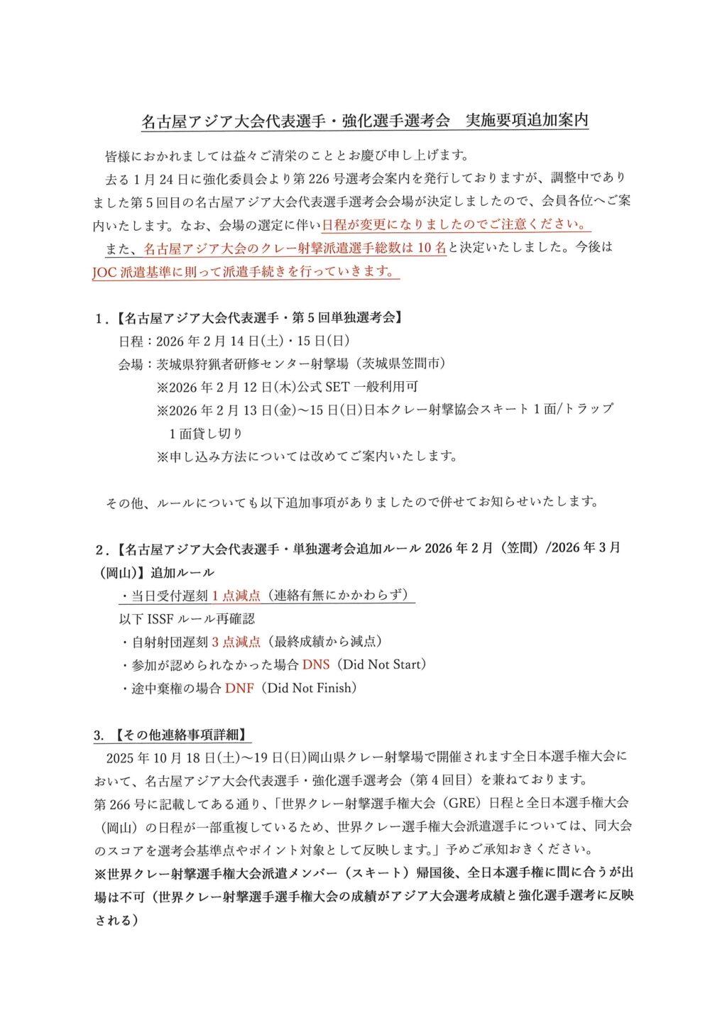 名古屋アジア大会代表選手・強化選手選考会 実施要項追加案内