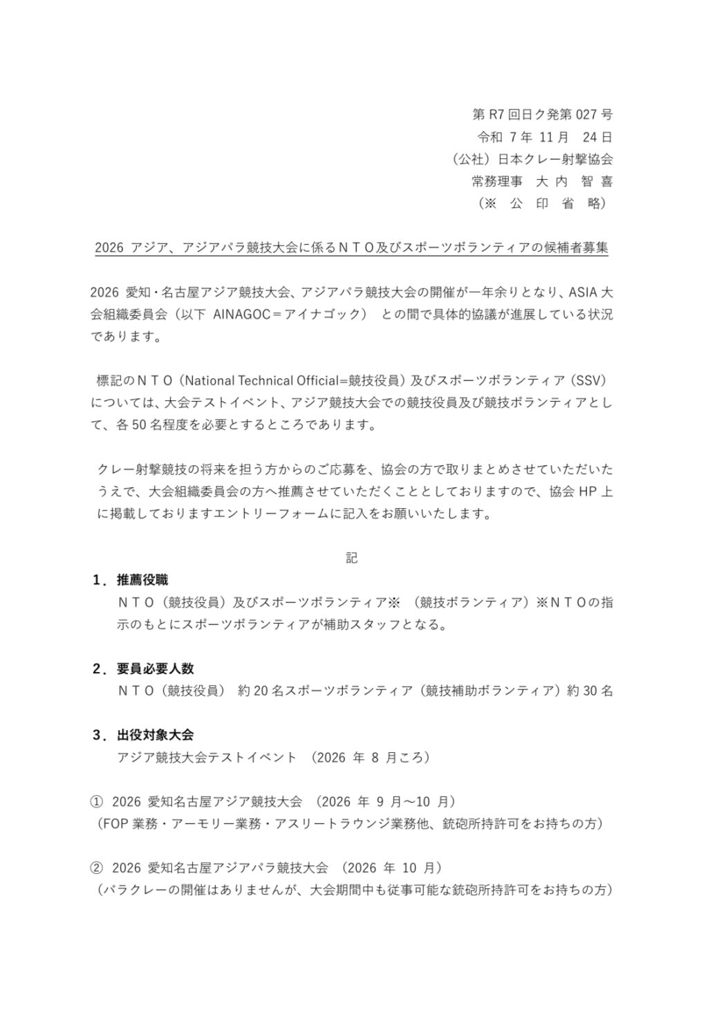 2026 アジア、アジアパラ競技⼤会に係るNTO及びスポーツボランティアの候補者募集 2025年11月24日2025年11月24日 2026 アジア、アジアパラ競技⼤会に係る NTO及びスポーツボランティアの候補者募集 【リンク】⇒参加申込はこちらから