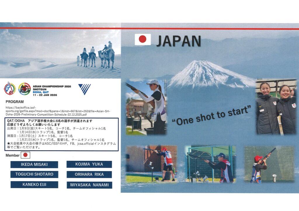 アジア選手権大会(ASIAN CHAMPIONSHIP)(DOHA, QAT 11-22 JAN 2026)選手派遣のお知らせ 2026年1月8日2026年1月8日 ASIAN CHAMPIONSHIP 2026 SHOTGUN DOHA,QAT