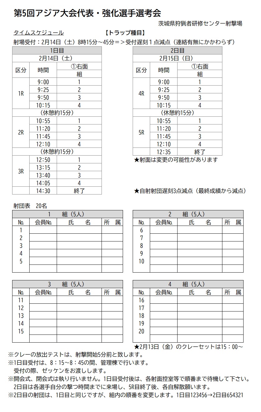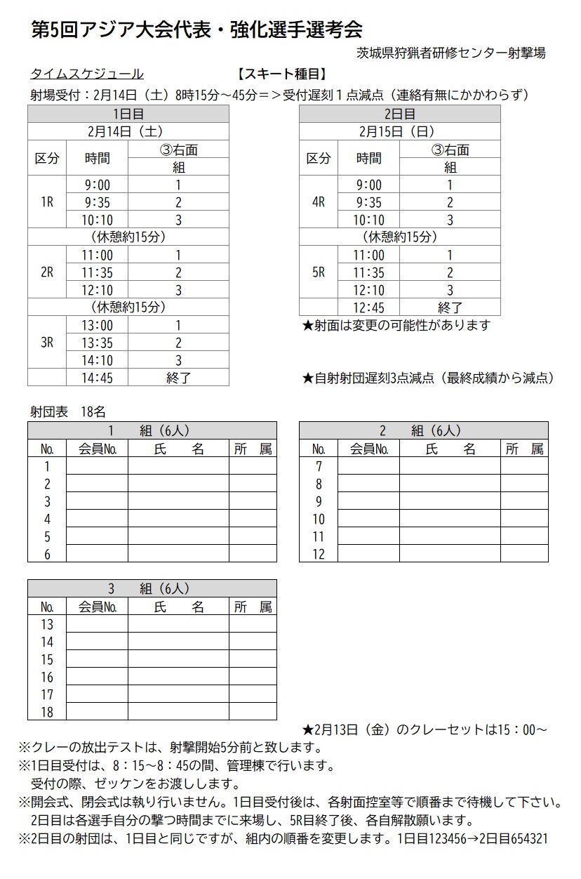 第5回名古屋アジア大会代表選手・2026-2027年度強化指定・育成選手選考会 タイムスケジュール 2026年2月7日2026年2月7日 第5回名古屋アジア大会代表選手 ・2026-2027年度強化指定・育成選手選考会 タイムスケジュール