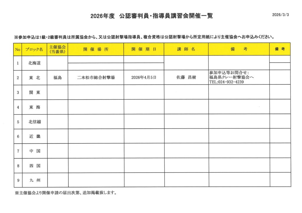2026年度公認審判員・指導員講習会開催一覧(2026年3月3日時点)
