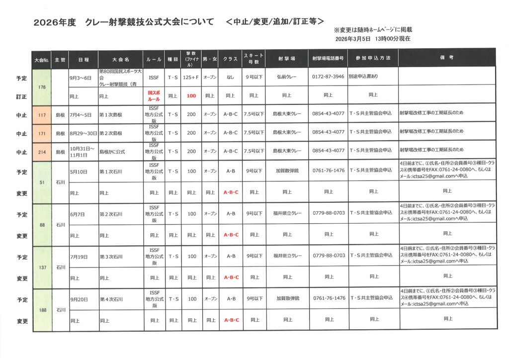 2026年度クレー射撃競技公式大会について(中止や変更等)