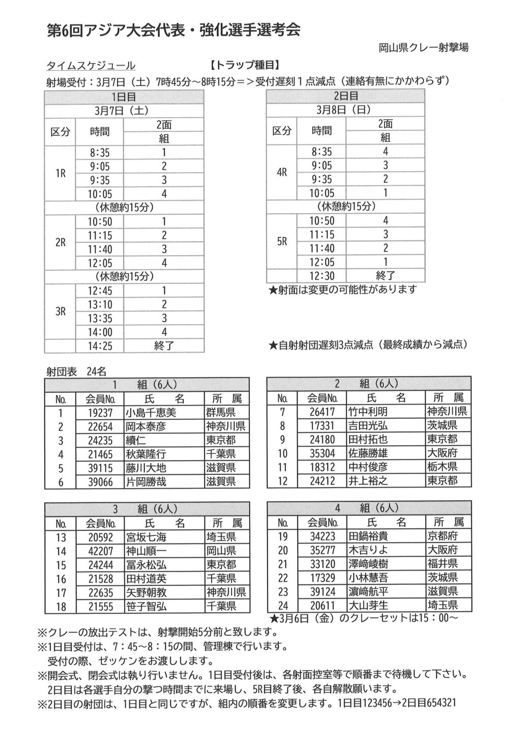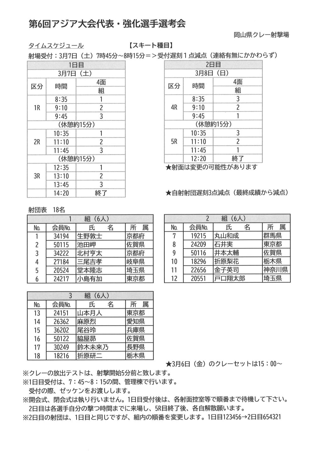 第6回名古屋アジア大会代表選手・2026-2027年度強化指定・育成選手選考会 タイムスケジュール・射団表 2026年3月6日2026年3月4日 第6回名古屋アジア大会代表選手・2026-2027年度強化指定・育成選手選考会 タイムスケジュール・射団表
