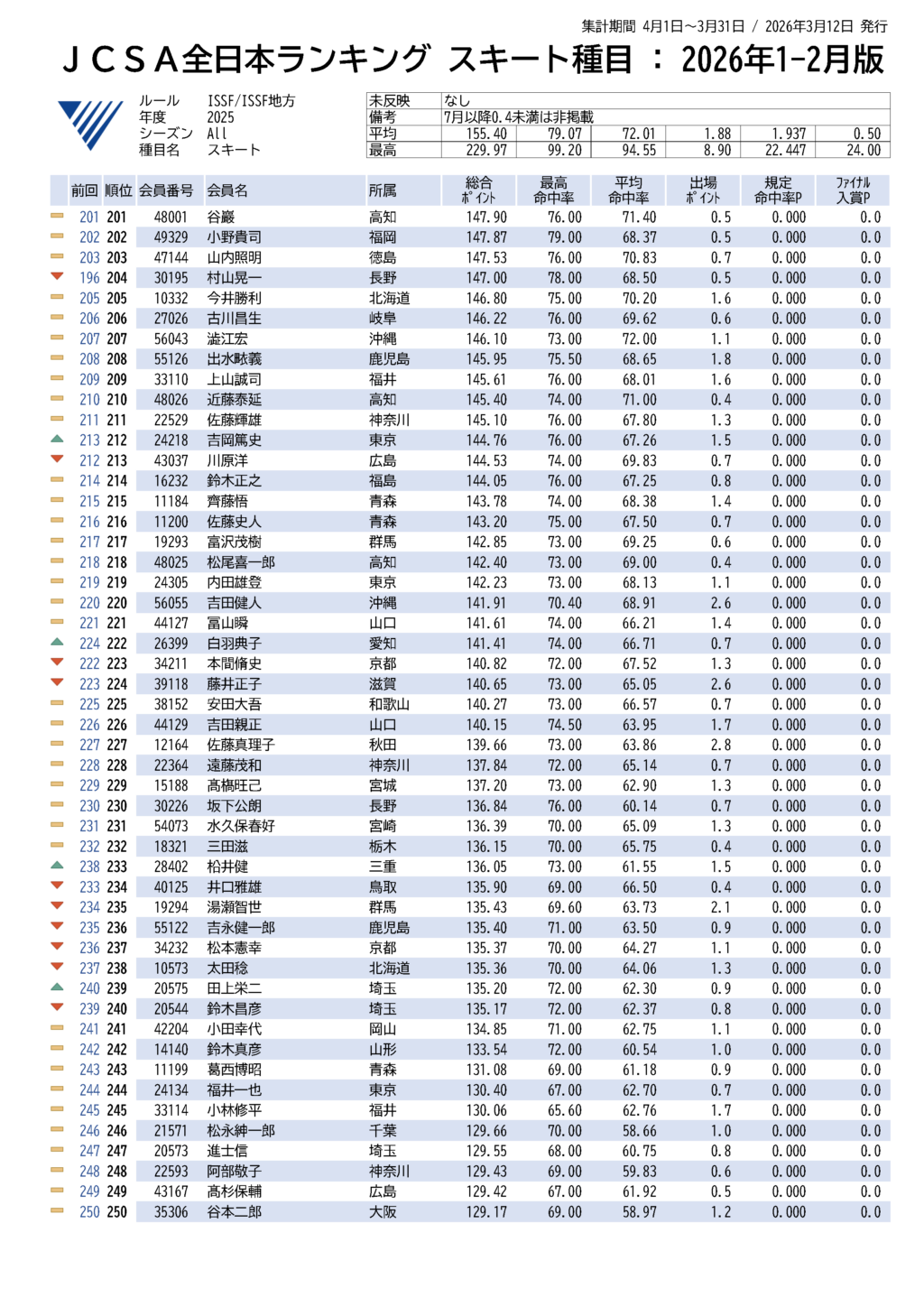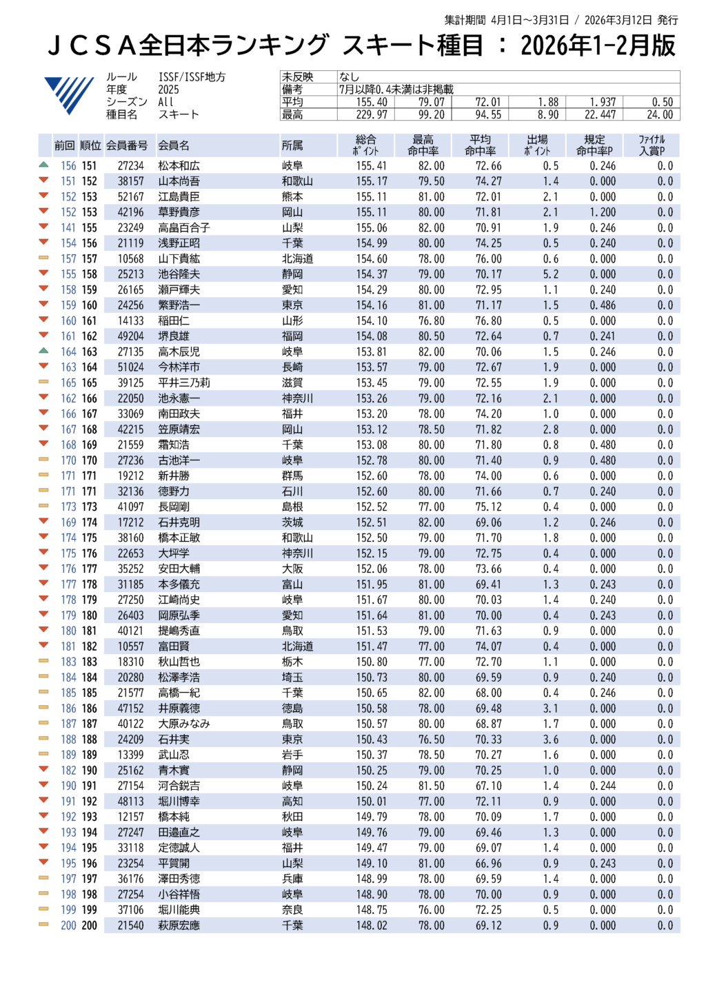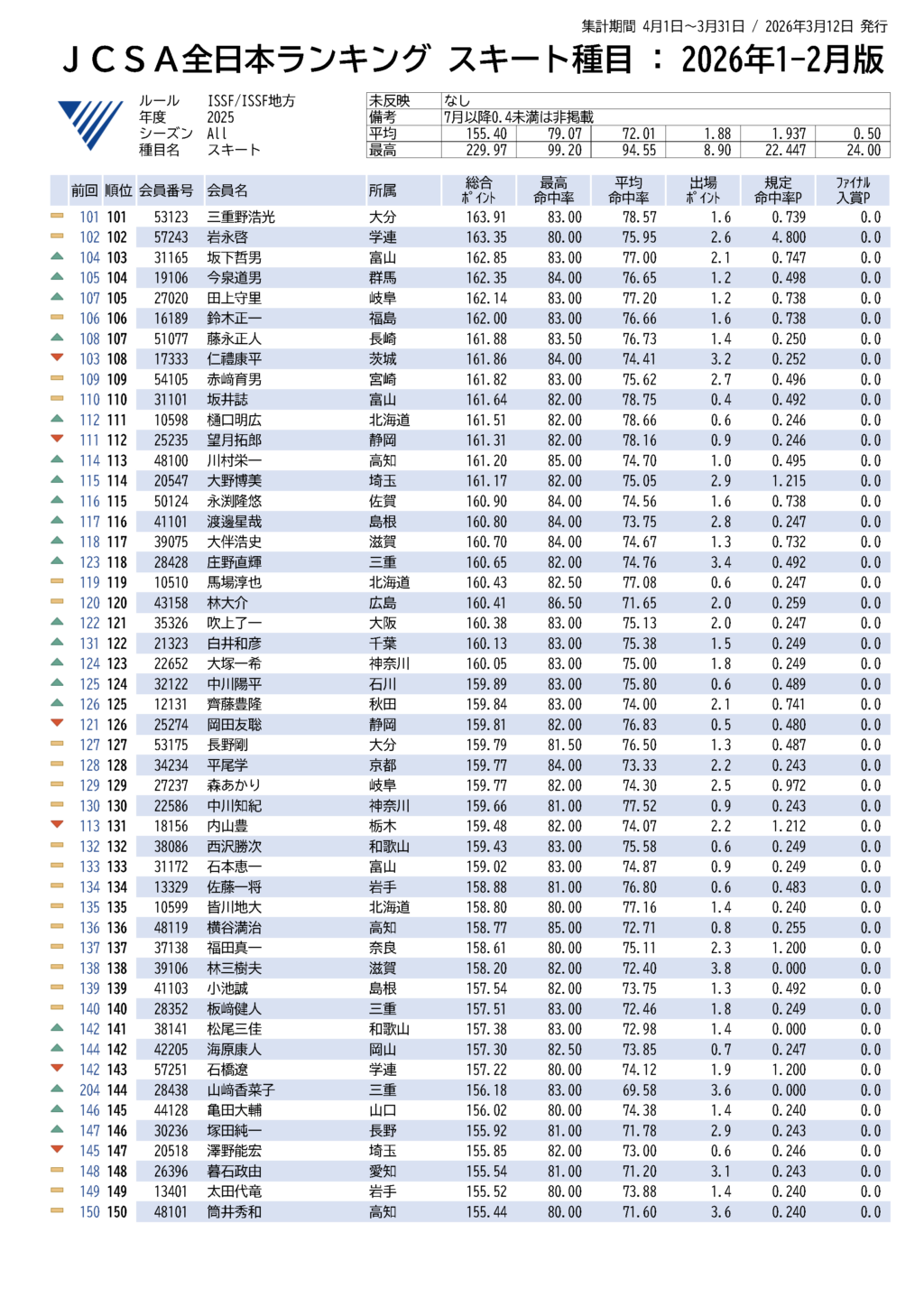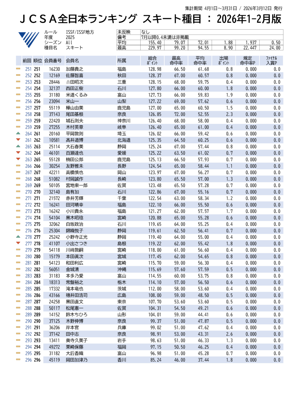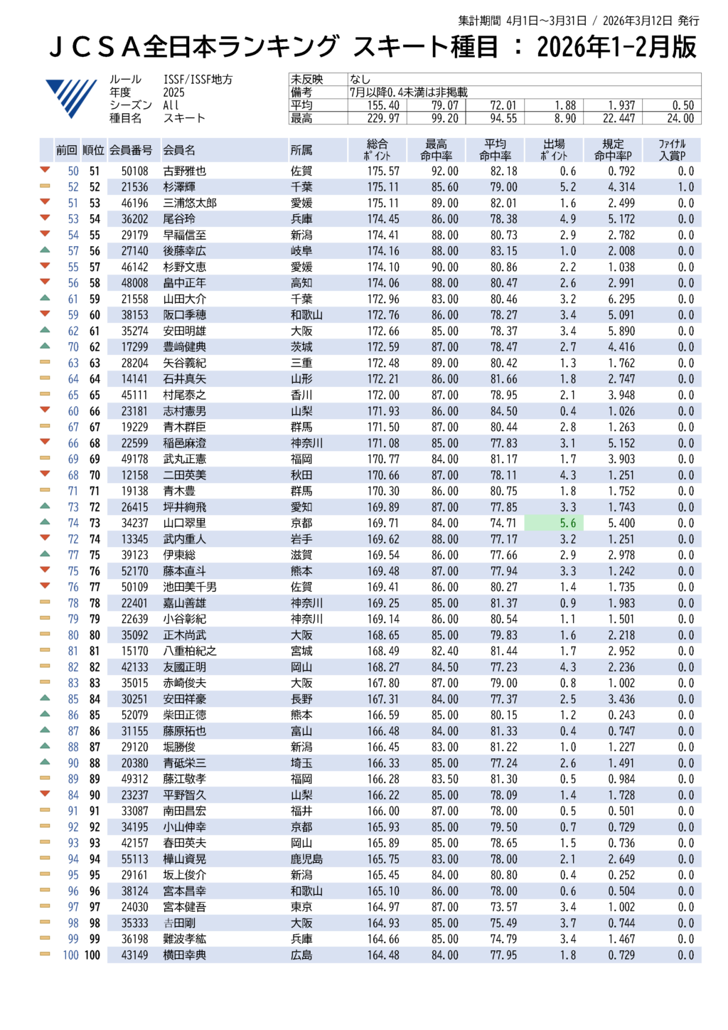 JCSA全日本ランキング(2025年度)発行元:競技委員会・審査委員会