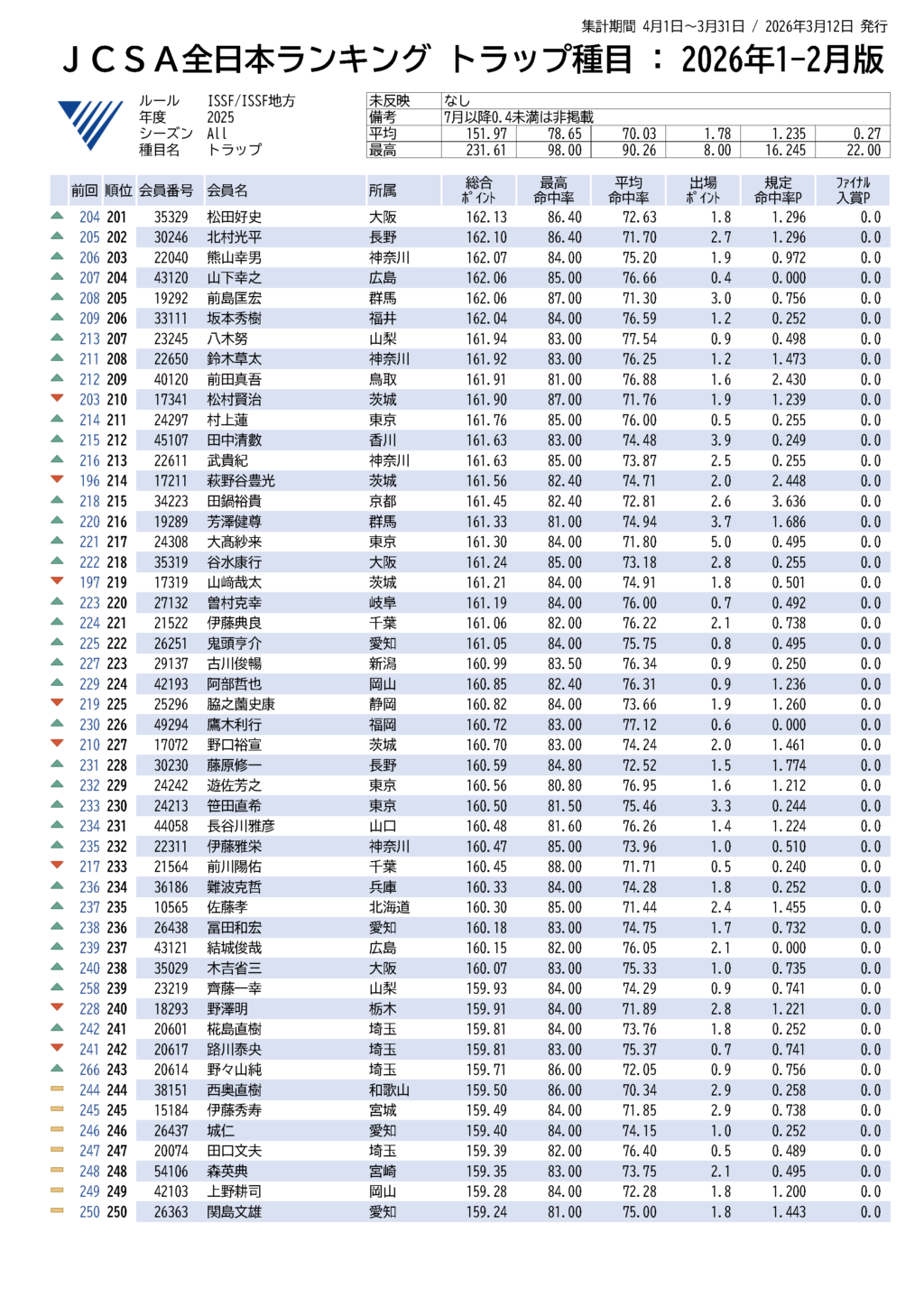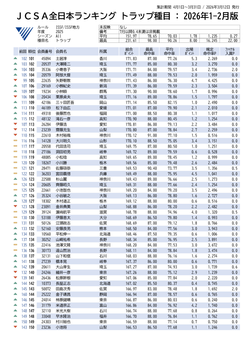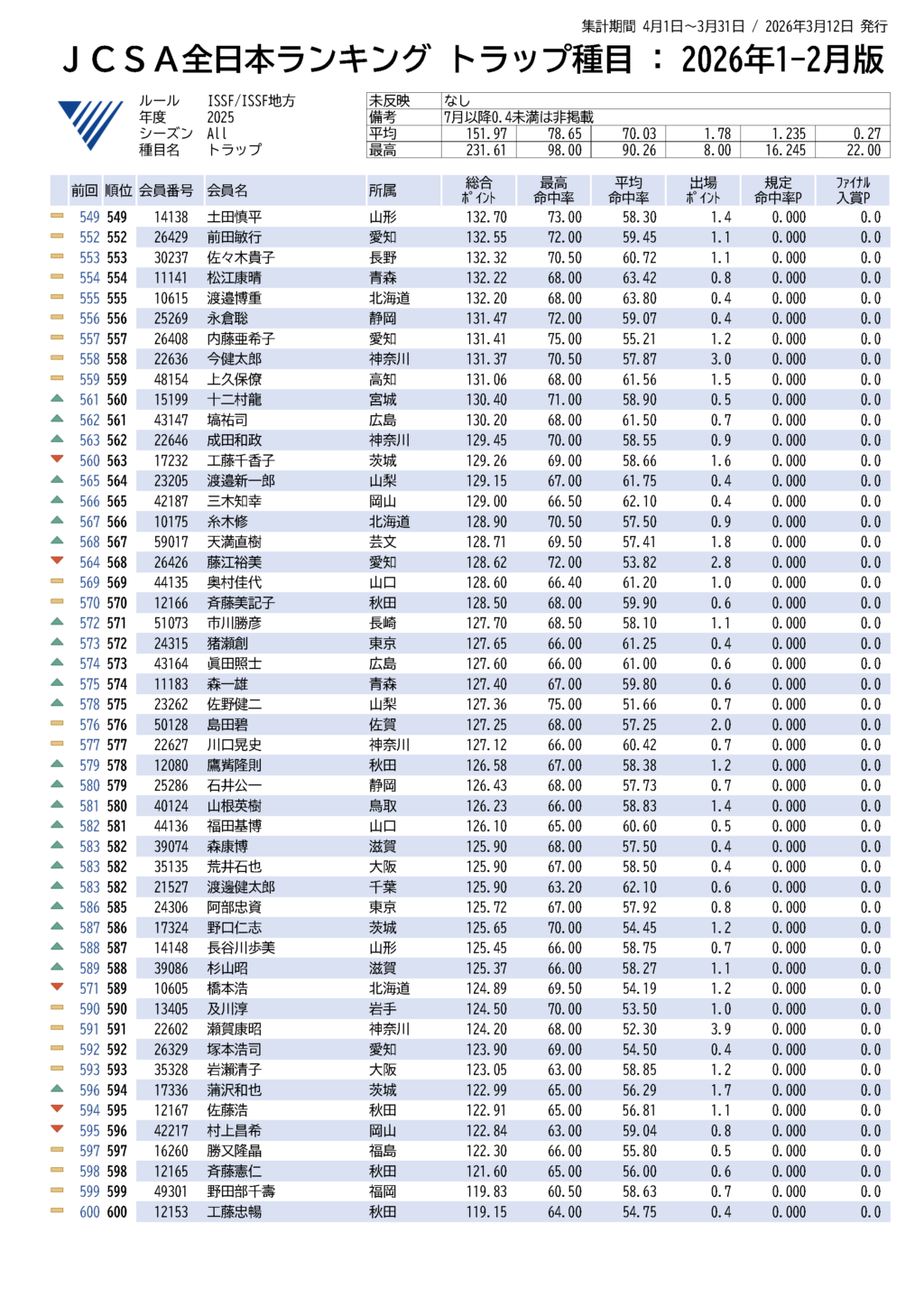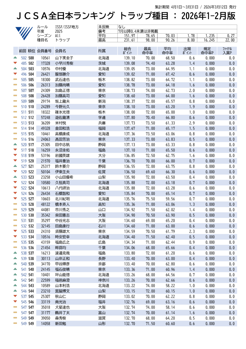 日本クレー射撃協会および国際射撃連盟(ISSF)公認の大会で、ISSFルールまたはISSF地方公式ルールが適用された大会を対象に、各選手が得たポイントの合計値により集計するものです。(対象期間4月1日~翌年3月31日)