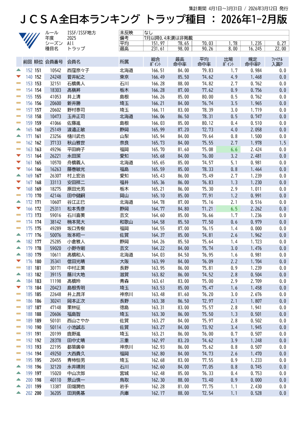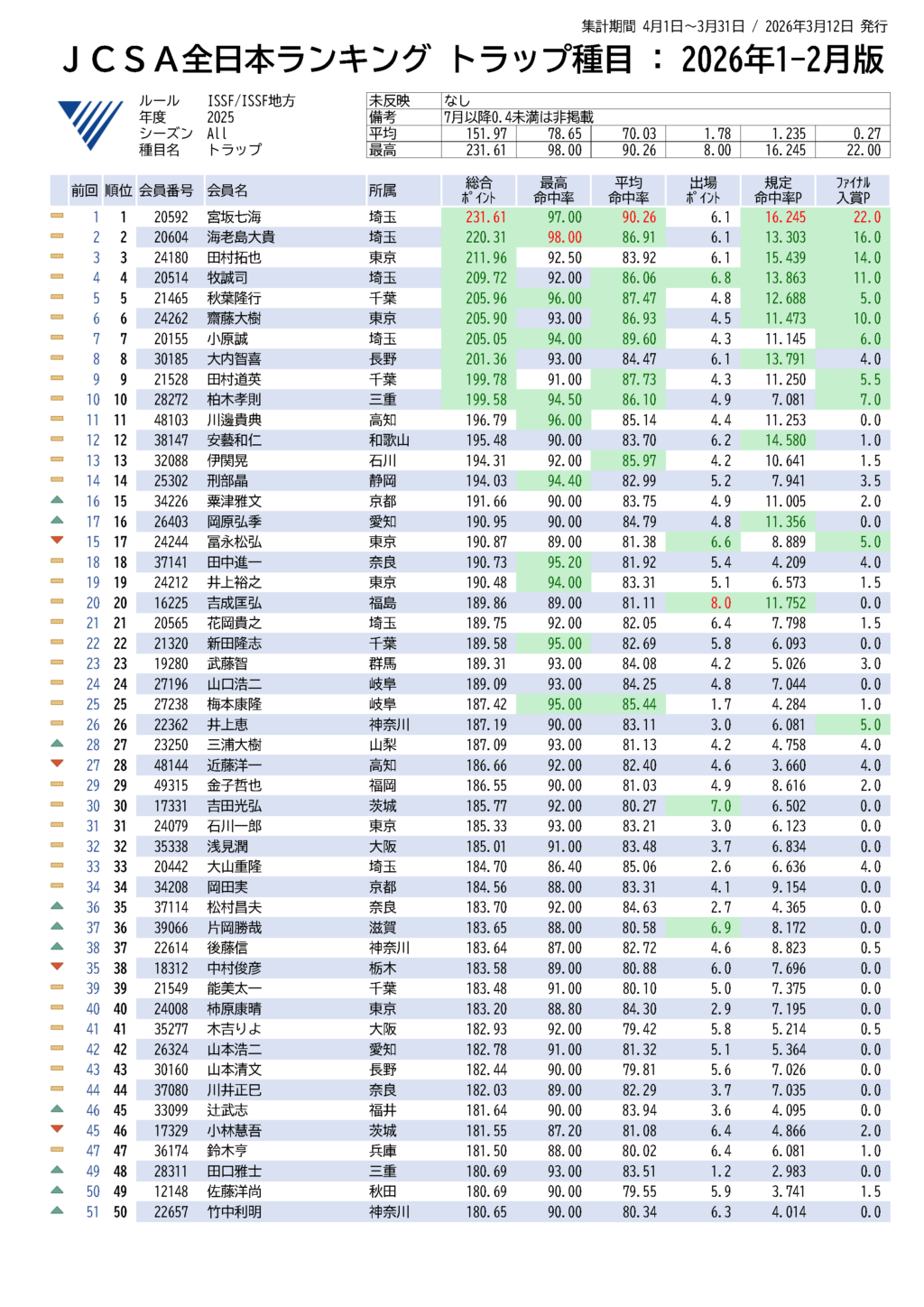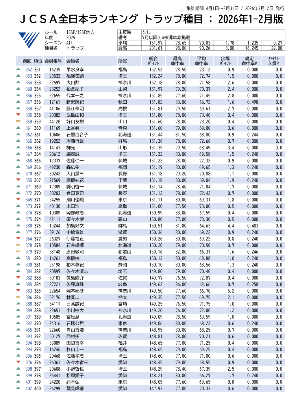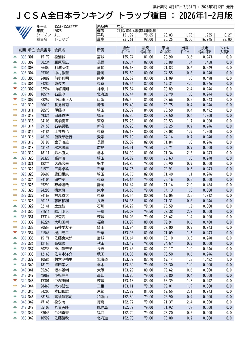 日本クレー射撃協会および国際射撃連盟(ISSF)公認の大会で、ISSFルールまたはISSF地方公式ルールが適用された大会を対象に、各選手が得たポイントの合計値により集計するものです。(対象期間4月1日~翌年3月31日)