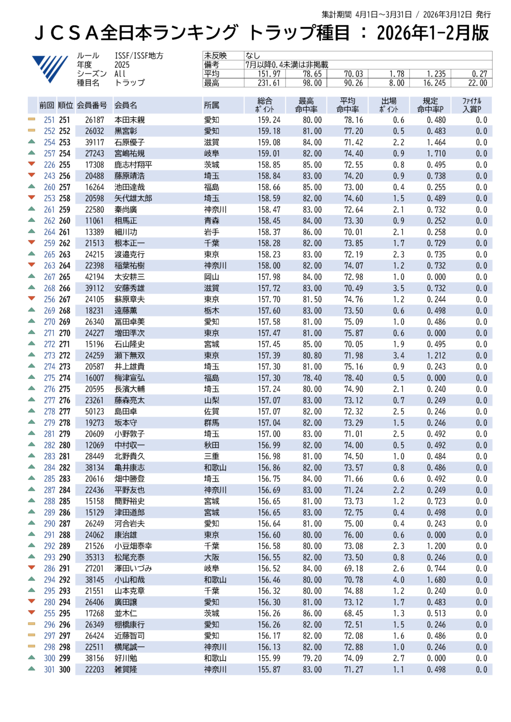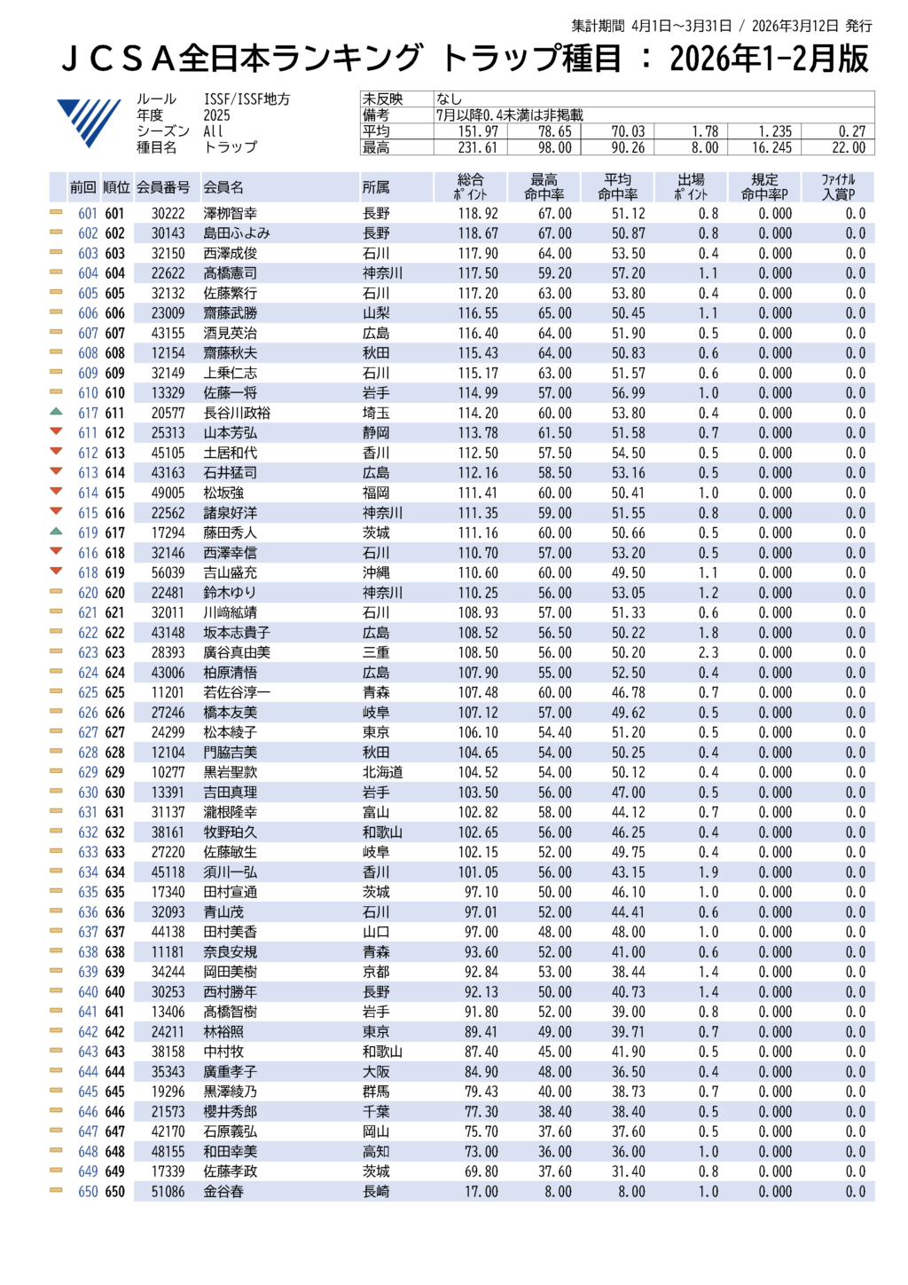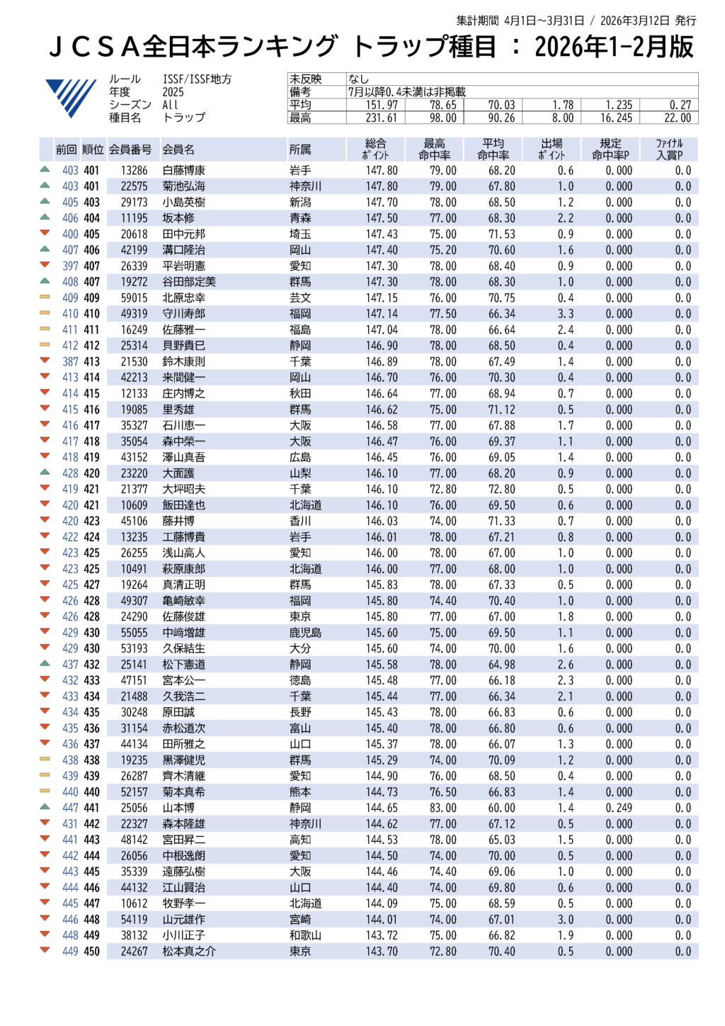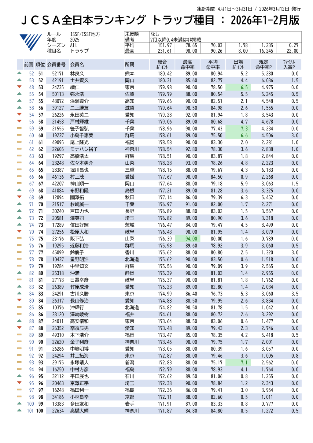日本クレー射撃協会および国際射撃連盟(ISSF)公認の大会で、ISSFルールまたはISSF地方公式ルールが適用された大会を対象に、各選手が得たポイントの合計値により集計するものです。(対象期間4月1日~翌年3月31日)