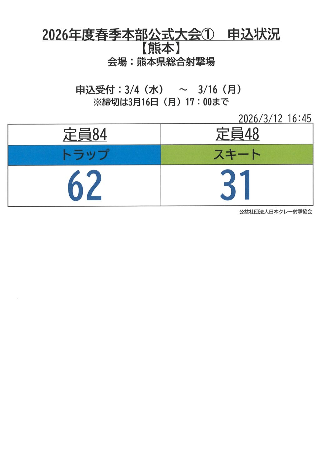 2026年度春季本部公式大会①熊本 申込状況<3月12日時点>